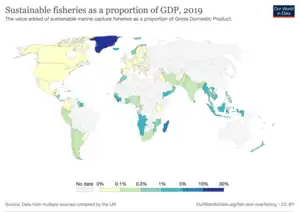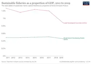 Contribuția acvaculturii și pescuitului la produsul intern brut (PIB) este unul dintre cei mai des utilizați indicatori ai performanței economice ale acestor sectoare[62]. Pescuitul și acvacultura pot contribui la atenuarea sărăciei, a foametei, a malnutriției și la creșterea economică. Contribuția pescuitului durabil la PIB-ul global a fost de aproximativ 0,1% pe an[63].