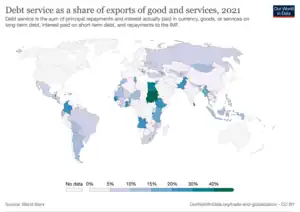 - Serviciul datoriei reprezintă suma rambursărilor principalului și a dobânzilor plătite efectiv în valută, bunuri sau servicii pentru datoria pe termen lung, dobânda plătită pentru datoria pe termen scurt și rambursările către Fondul Monetar Internațional