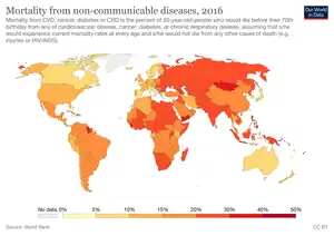 Programul Națiunilor Unite pentru Dezvoltare (PNUD) raportează că „la fiecare 2 secunde, o persoană cu vârsta cuprinsă între 30 și 70 de ani moare prematur din cauza bolilor netransmisibile - boală cardiovasculară, boală respiratorie cronică, diabet sau cancer”[4].