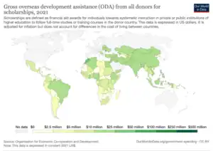 În 2018, valoarea totală a Asistenței Oficiale pentru Dezvoltare (AOD) pentru burse de studii a fost de 1,6 miliarde USD[28].