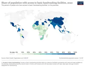 În 2017, 22% din unitățile de îngrijire a sănătății din țările cel mai puțin dezvoltate nu aveau apă curentă, un procent similar fiind cel al unităților lipsite de servicii de canalizare și de gestionare a deșeurilor[18]. Conform datelor statistice din estimarea de referință din 2017 a JMP, 4,5 miliarde de persoane nu aveau acces la facilități sanitare gestionate în siguranță[15].