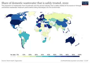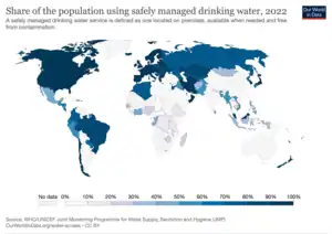 Programul comun de monitorizare a alimentării cu apă și canalizării (Joint Monitoring Programme for Water Supply and Sanitation - JMP) al Organizației Mondiale a Sănătății și Fondului Internațional pentru Urgențe ale Copiilor al Națiunilor Unite a precizat în 2017 că 4,5 miliarde de persoane nu aveau acces la sisteme de canalizare corespunzătoare[5]. Tot în 2017, doar 71% din populația globală a utilizat apă potabilă gestionată în condiții de siguranță, iar 2,2 miliarde de persoane nu aveau acces la apă potabilă gestionată în siguranță.