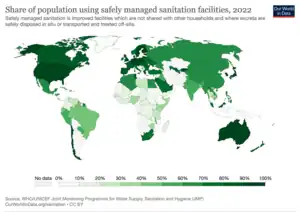 La nivel global, ponderea populației care utilizează servicii de canalizare gestionate în siguranță a crescut de la 28% în 2000 la 45% în 2017. America Latină și Caraibe, Africa subsahariană, Asia de Est și de Sud-Est au înregistrat cea mai mare creștere. În total, 701 milioane de persoane din întreaga lume au trebuit să practice defecarea în aer liber în 2017[6]. Acest număr s-a redus în 2020 la 673 de milioane de persoane[8].