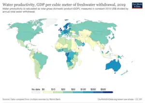 - Productivitatea apei este o măsură a modului în care apa este utilizată pentru a genera valoare economică, fiind calculată ca raportul dintre produsul intern brut total, măsurat în dolari SUA la valoarea din 2015 și extracția totală anuală de apă.