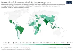 În 2017, finanțarea internațională pentru energia regenerabilă către țările în curs de dezvoltare a fost de două ori mai mare comparativ cu 2010. Cea mai mare parte din această finanțare (aproape jumătate) a fost destinată proiectelor de hidroenergie și aproape 20% proiectelor de energie solară[9]:10.