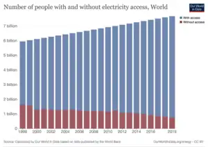 Un raport din 2019 a constatat că India, Bangladesh și Kenya au înregistrat progrese în furnizarea de energie electrică locuitorilor[4]:I. La nivel global, în 2020, 800 de milioane de persoane nu aveau acces la electricitate[8], comparativ cu 1,2 miliarde în 2010[4]:I.