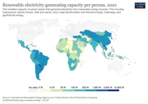 În 2022, capacitatea de producție per locuitor a energiei regenerabile în țările în curs de dezvoltare a crescut cu 58%. Cu toate acestea, fluxurile financiare internaționale către țările în curs de dezvoltare pentru sprijinirea energiei regenerabile au fost cu 24% mai mici decât în 2018[17]. În ciuda progreselor înregistrate în perioada 2019-2020, au existat evenimente globale recente, precum războiul din Ucraina, care au afectat progresul global în domeniul energiei regenerabile și tranziția spre decarbonizare.