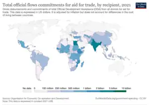 În 2018, „angajamentele de ajutor pentru comerț au rămas stabile, la 58 de miliarde de dolari, pe baza prețurilor actualizate”[13]. Asia de Sud și Asia Centrală „au primit cele mai mari ponderi ale acesteia (31,4%), urmate de Africa subsahariană (29,2%)"[13].