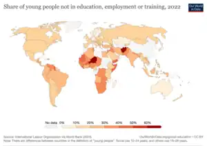 - en Our World in Data . „Share of youth not in education, employment or training” [Rata tinerilor care nu sunt nici angajați, nici nu urmează cursuri de educație sau formare]. ourworldindata.org (în engleză). Accesat în .