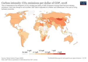 Potrivit unui raport de progres al ONU din 2020, „intensitatea emisiilor globale de dioxid de carbon a scăzut cu aproape un sfert din 2000, arătând o decuplare generală a emisiilor de dioxid de carbon de creșterea PIB”[3].