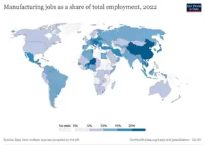 Rata de ocupare a forței de muncă în industrie la nivel global nu s-a modificat drastic. În 1991, rata de ocupare a forței de muncă în industrie a reprezentat aproximativ 21% din totalul ratei totale la nivel global, în timp ce în 2017 a reprezentat 22%[12].