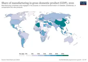 Industria este o sursă majoră de locuri de muncă. În 2016, țările cel mai puțin dezvoltate au înregistrat valori mai mici ale „valorii adăugate de producție per locuitor”. Valorile înregistrate de Europa și America de Nord a fost de 4.621 USD, comparativ cu aproximativ 100 USD în țările cel mai puțin dezvoltate[14].