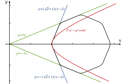 Dreptele octogonului tangente la hiperbolă sunt , iar asimptotele hiperbolei sunt .