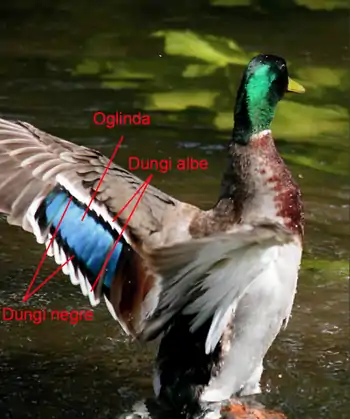 Rața mare (Anas platyrhynchos) are o oglinda mare, vânăt-violetă lucioasă, mărginită sus și jos de o dungă neagră, iar lângă aceasta se află una albă de-a curmezișul. La rață pestriță (Anas strepera) oglinda în mijloc este albă, în față și sus tivită cu negru. Masculul raței lingurar (Anas clypeata) are o oglinda verde, încadrată anterior și posterior cu alb; iar la femelă este mai puțin vie, sur-verzuie. La masculul raței cârâitoare (Anas querquedula) oglinda este sur-verzuie, tivită cu alb, la femelă oglinda este verde suriu palid. Oglinda masculului raței mici (Anas crecca) este verde metalic, sclipitoare, anterior de un negru catifelat, în partea de jos îngust albă, deasupra lat albă și încadrată cu ruginiu, iar femela are o oglindă mai mare, mai vie.[3]