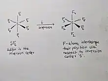 Într-o inversiune față de centru (elementul de simetrie), i, fiecare punct dintr-o moleculă este, deplasându-l la aceeași distanță de care este față de centru, pe cealaltă parte. Centrul de inversiune(d) este un punct din spațiu care se află în centrul geometric al moleculei. Ca rezultat, toate coordonatele carteziene ale atomilor sunt inversate (adică x, y, z la −x, −y, −z). Simbolul folosit pentru a reprezenta centrul de inversiune este i. Când operația de inversiune este efectuată de n ori, se notează cu in, unde in = E când n este par și in = −E când n este impar. AB6, AB4 planar, AB2C2 planar și trans, și etilena sunt câteva dintre exemplele de molecule care au centru de inversiune. Exemple de molecule fără centru de inversiune sunt C5H5− și AB4 tetraedric.[3]