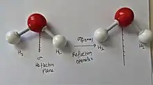 Operația de reflexie este efectuată față de un element de simetrie cunoscut sub numele de plan de reflexie (oglindă).[2] Este notat cu σ (sigma). Acest plan trebuie să treacă prin moleculă și nu poate fi complet în afara ei. Când acest plan de simetrie este paralel cu axa principală a moleculei (axa moleculară „z”), este considerat ca fiind un plan vertical (σv). Dacă planul de simetrie este perpendicular pe axa principală, atunci este notat drept plan orizontal (σh). Un plan diedru (σd) este al treilea tip de plan de simetrie, care bisectează unghiul dintre două axe, fiecare perpendiculară pe axa principală. Pentru a fi simetrică, o moleculă trebuie să genereze o imagine identică cu ea însăși la reflexia față de oricare plan de reflexie.