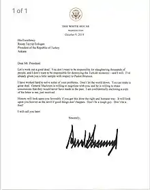 - Holland, Steve (). „Trump warned Erdogan in letter: 'Don't be a tough guy' or 'a fool'”. Reuters (în engleză). Accesat în .