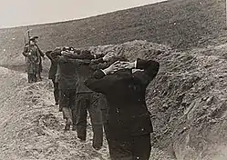 ![]() Execuția unor ostatici polonezi de catre o Einsatzgruppe SS (escadron al morții) la 20 octombrie 1939 la Kornik, în vestul Poloniei | |||
