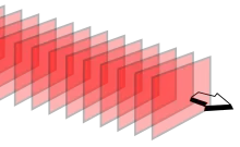 Pe măsură ce lumina traversează spaţiul, oscilează în amplitudine. În această imagine, fiecare maxim al amplitudinii este reprezentat printr-un plan. Raza de lumină este săgeata perpendiculară pe aceste suprafeţe paralele.