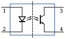 Diagrama schematică a unui optoizolator arătând sursa de lumină (LED-ul) în stânga, bariera dielectrică în centru, și senzorul (fototranzistorul) în dreapta