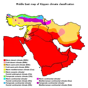 Orientul Mijlociu are, în general, un climat cald și arid, în special în Peninsula Sinai și regiunile egiptene. Câteva râuri mari furnizează apă pentru irigații, pentru a susține agricultura în zone limitate, cum ar fi Delta Nilului din Egipt, bazinele hidrografice ale râurilor Tigru și Eufrat din Mesopotamia (Irak, Kuweit și estul Siriei) și cea mai mare parte a ceea ce este cunoscut sub numele de Semiluna Fertilă. În schimb, coasta levantină și cea mai mare parte a Turciei au un climat mai temperat, oceanic și mai umed. Majoritatea țărilor care se învecinează cu Golful Persic au rezerve vaste de petrol, monarhii din Peninsula Arabică, în special, beneficiind din punct de vedere economic de exporturile de petrol. Din cauza climatului arid și a dependenței puternice de industria combustibililor fosili, Orientul Mijlociu contribuie atât la schimbările climatice, fiind și o regiune care se așteaptă să fie grav afectată negativ modificările climatice în viitorul apropiat.