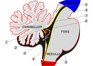 1. Vălul medular posterior; 2. Plexul coroid; 3. Cisterna cerebelo-medulară a spațiului subarahnoidian; 4. Canalul central al măduvei spinării; 5. Tuberculii cvadrigeminați; 6. Pedunculul cerebral; 7. Vălul medular anterior; 8. Ependima ce căptușește ventriculul; 9. Cisterna pontomedulară a spațiului subarahnoidian.