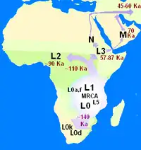 Prima linie care s-a ramificat de la Eva mitocondrială este haplogroupul L0[C]. Acest haplogroup se găsește în proporții mari în populațiile San din Africa de Sud, Sandawe din Africa de Est și pigmeii Mbuti din Congo. [28][29] Aceste grupuri s-au ramificate în etapa precoce de evoluție a umanității și de atunci au rămas relativ izolate genetic. Haplogrupurile L1, L2 și L3 au derivat din macrohaplogrupul L1-6 și sunt în mare parte limitate la populația africană. Macrohaplogrupurile M și N, linii ce caracterizează populația umană din afara Africii, au derivat din haplogrupul L3.