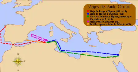 Paulus Orosius (n. circa 375, d. 418?),[4] a fost un istoric creștin, teolog și discipol al lui Augustin de Hipona din Gallaecia. El este cunoscut pentru „Historiarum Adversum Paganos Libri VII” („Șapte cărți de Istorie împotriva păgânilor”), pe care a scris-o ca răspuns la credința că declinul Imperiului Roman a fost rezultatul adoptării creștinismului.