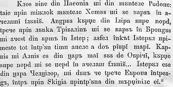Klos vine din Paeonia și din muntele Rodope: taie prin mijloc muntele Hemus și se varsă în acelașĭ fluviŭ. Angrus curge din Ilira spre nord, trece prin lunca Tribalină și se varsă în Brongus și acest din urmă în Ister; asfel [sic] încăt [sic] Isterul primește tot într’un timp apele a doă [sic] rîurĭ marĭ. Karpis și Alpis es [= ies] din țară maĭ sus de Obricĭ, curge spre nord și se perd [sic] în acelaș [sic] fluviŭ... Isterul ese [= iese] din țara Celților, și după ce trece Europa întreagă, întră [sic] prin Skiția printr’una din mărginile eĭ.
