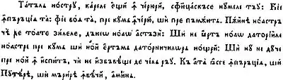 . Pentru î din prepoziția în și prefixul în- era utilizată o literă care arăta ca un lambda suprapus pe un I. Vezi în nota de subsol linkul către rugăciunea Tatăl nostru scrisă în alfabetul chirilic românesc de dinainte de simplificarea lui sub forma alfabetului de tranziție.)
