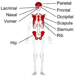 ![]() Oase plate în scheletul uman. (afișat cu roșu) | |