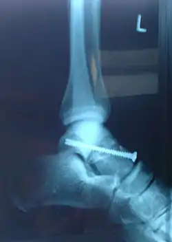 Fractură cominutivă a colului talusului tratată prin osteosinteză internă (fixarea fragmentelor fracturii cu șurub)