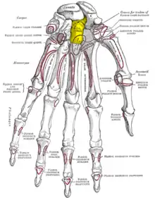 Osul capitat (în galben) văzut pe fața palmară (anterioară) a mâinii stângi