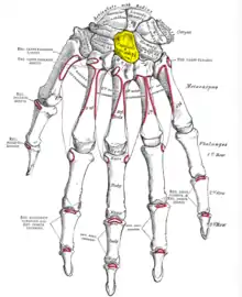 Osul capitat (în galben) văzut pe fața dorsală (posterioară) a mâinii stângi