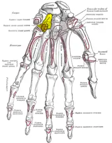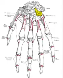 Osul cu cârlig (în galben) văzut pe fața dorsală (posterioară) a mâinii stângi