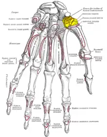 Trapezul (în galben) văzut pe fața dorsală (posterioară) a mâinii stângi