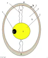 1 - coaja; 2 - albușul; 3 - gălbenușul; 4 - șalaze; 5 - disc germinativ