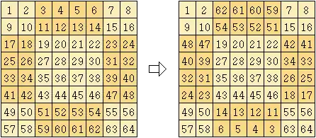 Fie progresia aritmetică 1, 2, 3, 4, ... 36 (pătrat de ordinul 6) și dispunerea numerelor pe două rânduri în zigzag: