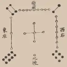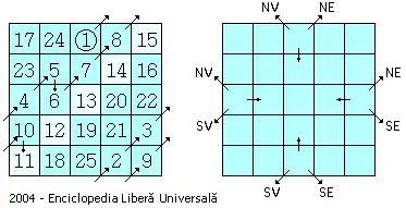 Evident, se putea începe în orice căsuță centrală a rândurilor sau coloanelor perimetrale, fiind în fiecare caz direcția diagonalelor în afara pătratului și sensul deplasării o dată terminată fiecare diagonală dat prin poziția relativă din centrul pătratului în ceea ce privește căsuța centrală.