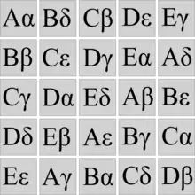 O variantă a pătratului latin este pătratul greco-latin : un tablou de șah pătrat de latură n cu perechi de simboluri pe fiecare pătrat, aranjate astfel încât fiecare simbol să apară unul și o singură dată în fiecare rând și în fiecare coloană și ca fiecare pereche să apară o singură dată.