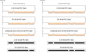 Specificațiile PCI convențional oferă opțiuni pentru semnalizare de 3,3 V, lățime bus 64-bit, și clocking de 66 MHz, dar acestea nu sunt des întâlnite cu excepția plăcilor de bază PCI-X server.