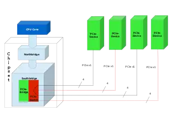 Un sistem PCIe este compus din legături PCIe care interconectează un set de componente. Principalele componente ale acestei topologii sunt un complex rădăcină, multiple puncte terminale (dispozitive de I/E), un comutator și o punte PCIe-PCI, interconectate prin legături PCIe.
