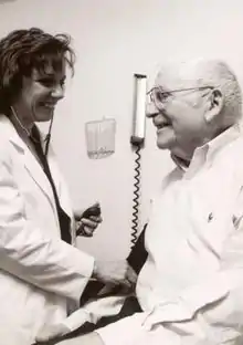 Un pacient căruia un medic îi măsoară tensiunea arterială.