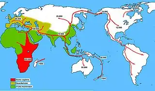 Acum 50.000-40.000 de ani, primii oameni au sosit în Australia. Acum 45.000 ani, oameii s-au răspândit în Europa de Nord, în zona de climă rece. [8] Acum 30.000 ani, primii oameni au sosit în Japonia, iar acum 27.000 ani, Siberia a fost populată, deasupra cercului polar. [8]