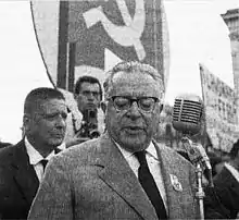 Palmiro Togliatti (n. , Genova, Italia – d. , Ialta, RSS Ucraineană, URSS) a fost un politician italian, lider al Partidului Comunist Italian din 1927 și până la moartea sa. Susținătorii l-au poreclit Il Migliore („Cel mai bun”).[13] În 1930, a devenit cetățean al Uniunii Sovietice,[14] țară în care un oraș a fost numit după el: Toliatti.