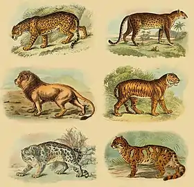 | Subfamilia Pantherinae (de la stânga): jaguar, leopard, leu, tigru, leopardul zăpezilor și leopard de copac | |