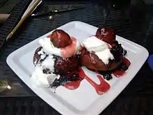 Papanași ornați cu dulceață de vișine și zahâr pudră