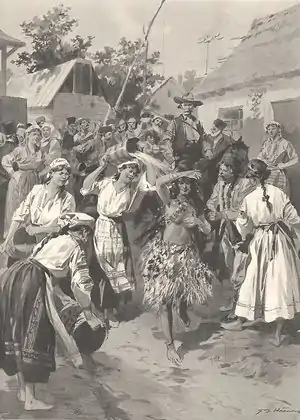 „În vremea verii, când semănăturile sunt primejduite de secetă, oamenii de la țară îmbracă o copilă mai mică de 10 ani cu o camașă făcută din frunze de copaci și buruieni. Toate celelalte copile o urmează și se duc jucând și cântând prin împrejurimi; iar oriunde sosesc, babele au obiceiul de le toarnă apa rece în cap. Cântecul pe care-l cântă este alcătuit cam așa: Papalugo, suie-te la cer, deschide-i porțile, trimite de acolo ploaia aici, ca să crească bine secara, graul, meiul și altele!" [3]”