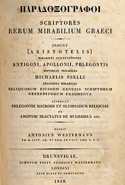 - Anton Westermann, Paradoxographoi. Scriptores rerum miriabilium graeci, Braunschweig și Londra, 1839.