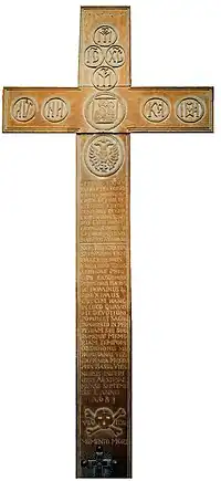 Noi, Șerban Cantacuzino, din mila lui Dumnezeu principe al Valahiei Transalpine, domn și singur stăpân al ei etc. am ridicat această cruce în locul sfânt la care poporul se poate închina în orice zi, cinstit întru veșnică memorie a sa și a lor săi, în timpul asediului Vienei din Austria Inferioară de către mahomedanii conduși de vizirul Kara-Mustafa Pașa, 1 septembrie 1683.